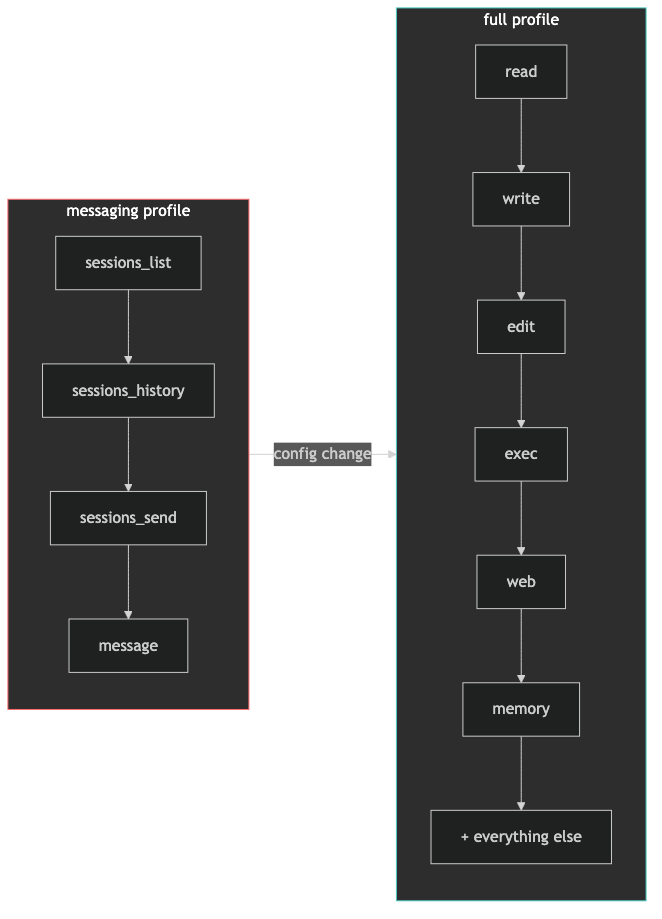 OpenClaw ships with something called “tool profiles”—presets that control what an agent can and can’t do. Out of the box, Tars was running the messaging profile. Sounds reasonable. Here’s what that actually means: