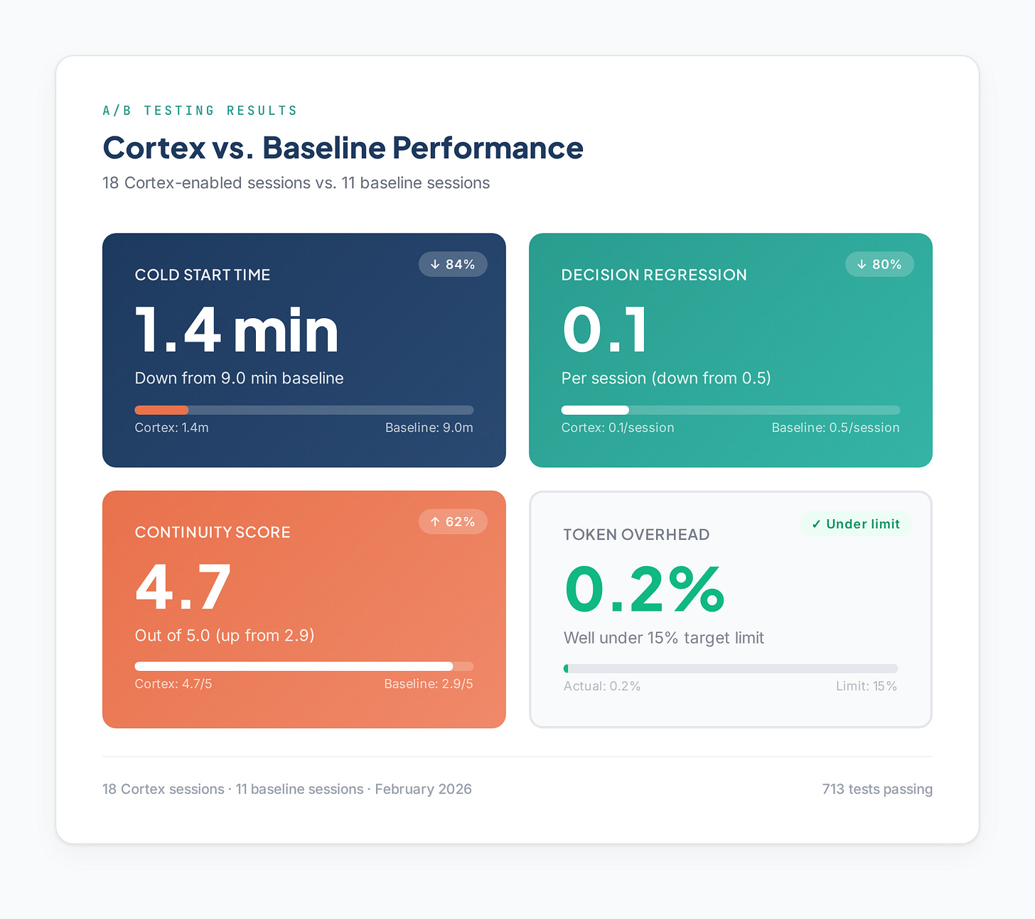 Real-world testing validates the design—84% cold start reduction, 80% decision regression reduction, 0.2% token overhead.