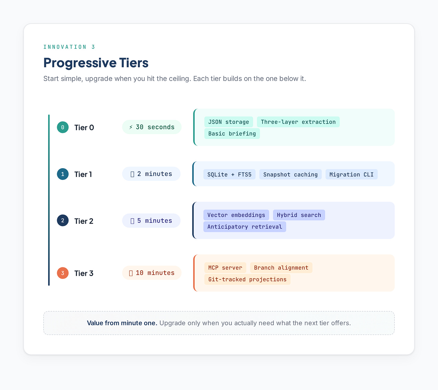 Progressive tiers mean you start simple and add complexity only when you need it. Tier 0 alone made a noticeable difference.