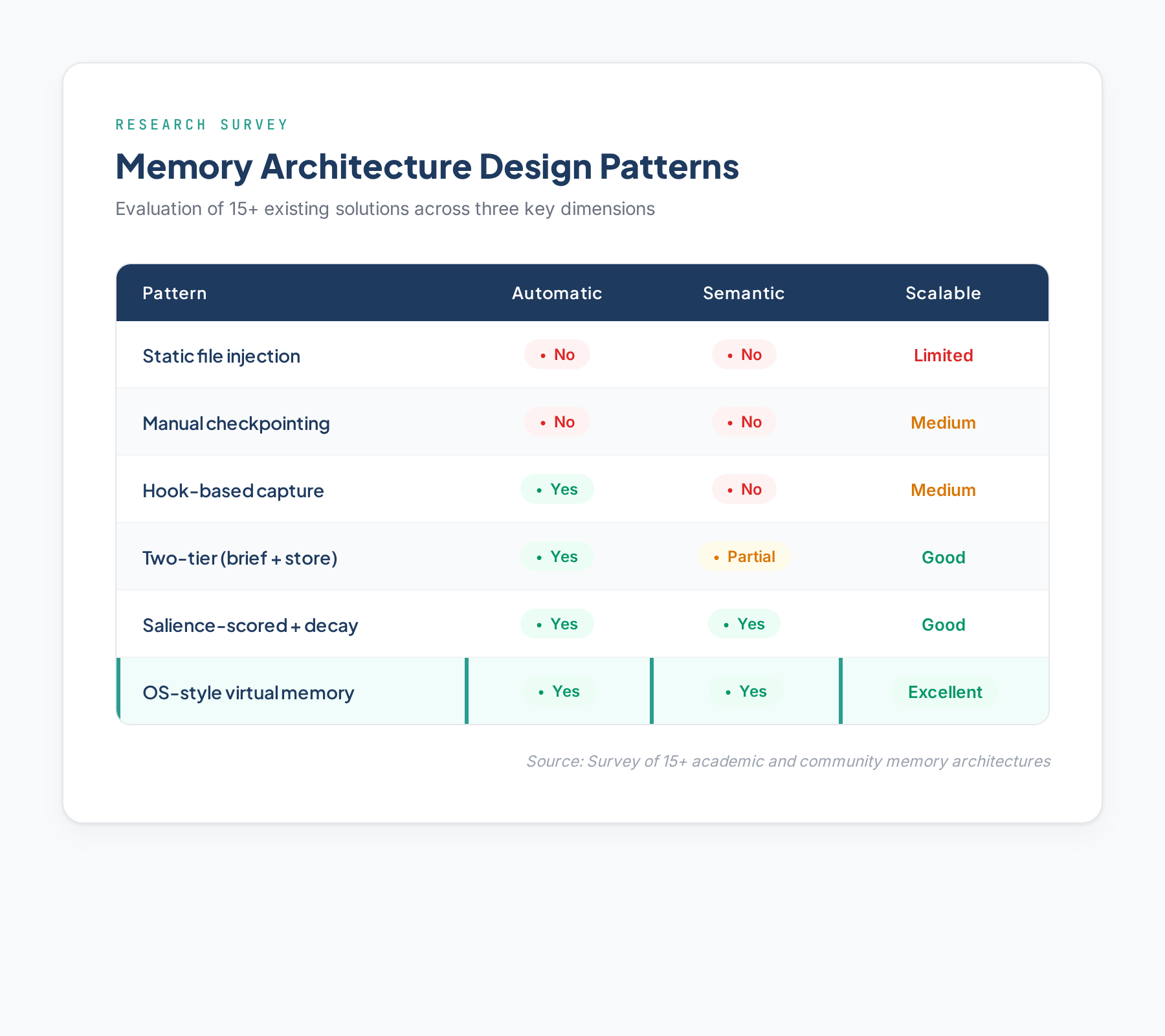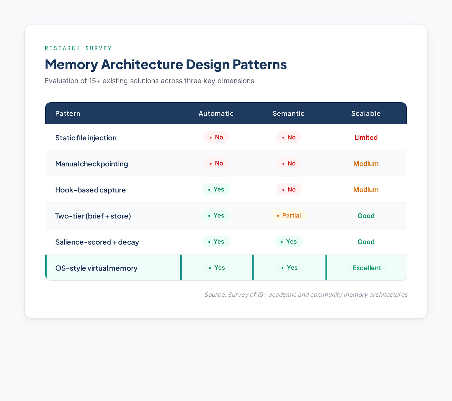 I examined academic architectures (MemGPT, MIRIX, Nemori) and community tools (claude-cortex, memory-mcp, claude-diary). Six distinct design patterns emerged: