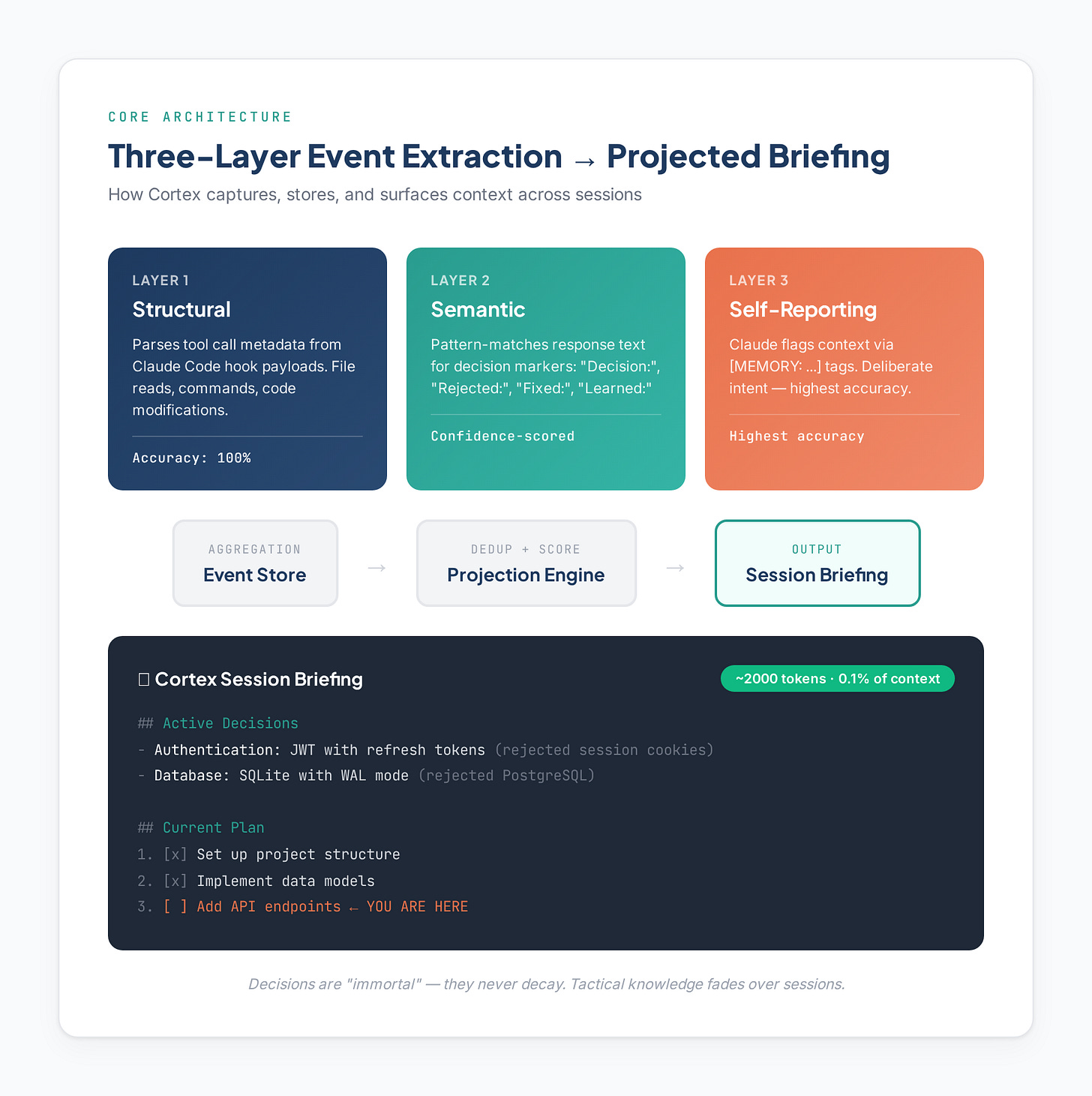 Layer 2 (Semantic): Pattern-matches Claude’s response text for decision markers. Look for phrases like “Decision:”, “Rejected:”, “Fixed:”, and “Learned:” at line starts. Confidence-scored based on pattern strength.