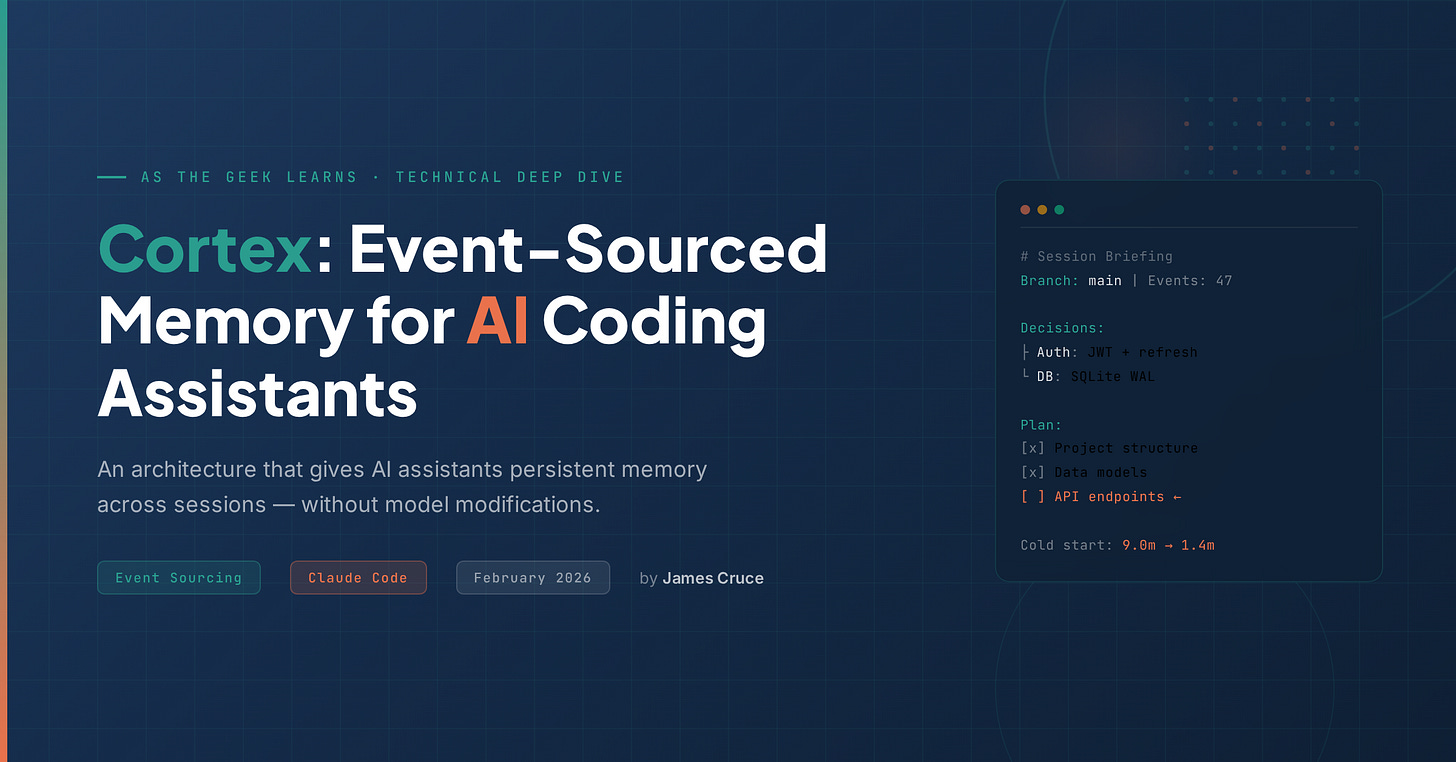 If you’ve used AI coding assistants for anything beyond a single session, you know this frustration. Cortex is my answer: an event-sourced memory architecture that captures context automatically, persists it across sessions, and projects it back when you need it—no model modifications, no manual upkeep.